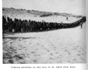 The Turkish held off, but it was not until early next morning that, on the arrival of the 3rd Light Horse Brigade at Sheikh Zowaiid, the Welsh ambulance convoy received orders to return to Magruntein. At 8 a.m. the wounded were sent to Sheikh Zowaiid, and early the same afternoon all the sandcarts of the 52nd Division arrived from El Arish and evacuated them to the receiving station there. Some of these sandcarts went out close to Rafa to bring in a number of wounded Turks who had been missed, and arrived back at Sheikh Zowaiid at 5.30 a.m. on January 11 without molestation, although the rearguard had come in. After treatment and a night’s rest at Sheikh Zowaiid the remainder of the wounded were evacuated in the 1st Light Horse Field Ambulance transport and two Welsh ambulance convoys to El Arish, where they arrived at 6 p.m. Thence they were taken away to Kantara on January 12 by ambulance train, which now came within three miles of El Arish.