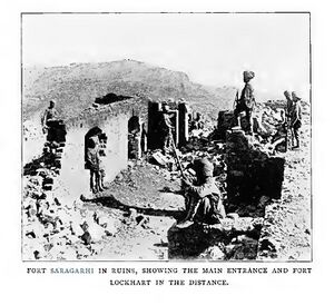 معركة سرگرهي Battle of Saragarhi كانت last-stand battle fought before the Tirah Campaign between the British Indian Empire and Afghan tribesmen.[8] On 12 September 1897, an estimated 12,000 – 24,000 Orakzai and Afridi tribesmen were seen near Gogra, at Samana Suk, and around Saragarhi, cutting off Fort Gulistan from Fort Lockhart. The Afghans attacked the outpost of Saragarhi where thousands of them swarmed and surrounded the fort, preparing to assault it.[9] Led by Havildar Ishar Singh, the 21 soldiers in the fort—all of whom were Sikhs—refused to surrender and were wiped out in a last stand. The post was recaptured two days later by another British Indian contingent.