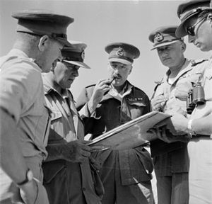 القائد البريطاني نيل ريتشي (في الوسط) بين قادته 31 مايو 1942