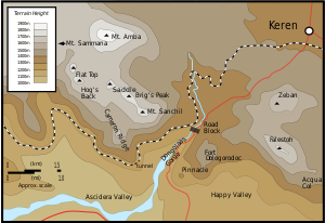 Anglo-Egyptian Sudan shared a 1،600 km (1،000 mi) border with the AOI, and on 4 July 1940, was invaded by an Italian force of about 6,500 men from Eritrea, which advanced on a railway junction at Kassala and forced the British garrison of 320 men of the SDF and some local police to retire, after inflicting casualties of 43 killed and 114 wounded for ten casualties.[2][3] The Italians also drove a platoon of No 3 Company, Eastern Arab Corps (EAC) of the SDF, from the small fort at Gallabat, just over the border from Metemma, about 320 km (200 mi) south of Kassala and took the villages of Qaysān, Kurmuk, and Dumbode on the Blue Nile. From there the Italians ventured no further into Sudan, owing to lack of fuel. They proceeded to fortify Kassala with anti-tank defences, machine-gun posts and strong-points, later establishing a brigade-strong garrison. The Italians were disappointed to find no strong anti-British sentiment among the native population.[4][5]