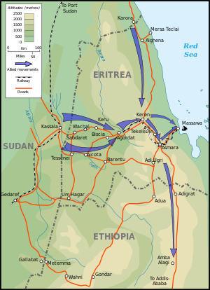 The British responded by building up a force of more than two divisions in Sudan and three in Kenya by early February 1941. The Sudan-based forces—commanded by Lieutenant-General William Platt and under the command of General Archibald Wavell (Commander-in-Chief British Middle East Command)—had launched an attack into Eritrea through Kassala on 18 January and by 1 February had captured Agordat some 160 km (100 mi) east of Kassala.[1]