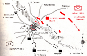 The French advance guard caught up with Josef Vukassovich's Austrian rear-guard at about 9 am on 10 May and after a clash followed them towards Lodi. Vukassovich was soon relieved by Gerhard Rosselmini's covering force near the town. The town's defences were not strong, the defenders were few, and the French were able to get inside and make their way towards the bridge. The span was defended from the far bank by nine battalions of infantry arrayed in two lines and fourteen guns. The Austrian general in command at Lodi, Sebottendorf, also had four squadrons of Neapolitan cavalry at his disposal, giving him a total of 6,577 men, who were mostly completely exhausted after a hasty forced march. Sebottendorf decided that it was inadvisable to retire in daylight, and opted to defend the crossing until nightfall.[7]