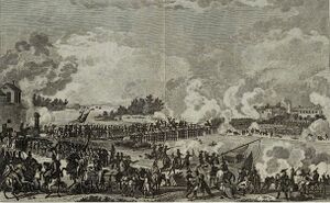 After bombarding the Austrian positions for several hours, at about 6 pm the French prepared to attack. Marc Antoine de Beaumont's cavalry was sent to ford the river upstream while the 2nd battalion of carabiniers (elite light infantry) was readied inside the walls of the town for an assault onto the bridge itself. The carabiniers stormed out of the gates and onto the bridge. Vigo-Roussillon tells us that the enemy artillery fired one salvo when the troops were part-way across, causing numerous casualties, at which point the column wavered and stopped. It was then that a number of senior French officers, including André Masséna, Louis Berthier, Jean Lannes, Jean-Baptiste Cervoni, and Claude Dallemagne, rushed to the head of the column and led it forward again.[12] [13] (Some authorities suggest that the French retreated and attacked again, but an important Austrian source supports the thesis of a single attack.)[بحاجة لمصدر]