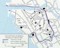 • لحماية المدينة والمدنين فرضت قيود صارمة على القوات الأمريكية والمدفعية والدعم الجوي من قبل ماك آرثر.و لكن الدمار كان لا بد منه لان فرق المشاة اليانانية كانت تهاجم المبنى تلو المبنى، والبحيرية اليابانية بقيادة البحار ايوابوشي قامت بالهجوم عبر قاذفات اللهب والقنابل اليدوية والبازوكا، عندما بدأت المجزرة فتعرضت المدينة للقصف المتواصل وقام اليابانيون بارتكاب العديد من أعمال وحشية قاسية(العنف والتشويه والاغتصاب والمجازر على السكان) رافقت المعركة من أجل السيطرة على المدينة، التي تحولت إلى انقاض فيما بعد.