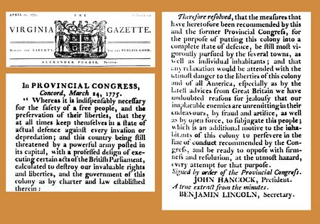 - "In Provincial Congress / Concord, March 24, 1775". The Virginia Gazette. Williamsburg, Virginia. April 21, 1775. p. 15. – Massachusetts Provincial Congress resolution to put the colony into "a complete state of defense"