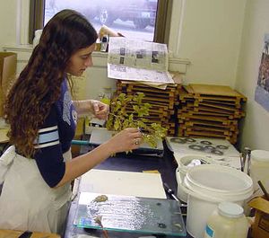 وعلى طاولة العمل يتم تجهيز المكابس الخشبية (لوحان من الخشب مقياس عالمي .3 x 45سم -بهما ثقوب للتهوية ) واوراق جرائد - مطوية - واوراق كرتون لتشرب الماء ، حيث يوضع احد اللوحين علي الطاولة ثم يوضع طبقة من الكرتون والجرائد ، وترص العينات في طبقات تفصل بينها الجرائد او اوراق التجفيف ، على ان تفرد اوراق كل عينة فردا كاملا ، وترص طبقة اخري ، وهكذا حتى يتكون مجلد كبير من الطبقات ، ثم تغطى باللوح الخشبي الثاني ويربط اللوحان بالحبال للضغط على العينات حتى تفقد محتواها المائي ومن ثم تتشربه أوراق الجرائد. وتترك لمدة يومين في مكان جيد التهوية ، ثم يعاد تغيير الجرائد بجرائد أخرى جديدة ، وهكذا لمدة ثلاث او اربع مرات حسب طبيعة العينات النباتية والتقدير الشخصي لمدى جفاف العينات ، فكلما كانت العينات النباتية عصيرية كلما احتاجت إلى تبديل أوراق التجفيف على فترات متقاربة عدة مرات ..( يلجأ بعض الهواة الى ضغط العينات النباتية بين اوراق بعض الكتب القديمة ، ووضع ثقالات كقوالب الطوب عليها وهي طريقة مقبولة ولا تحتاج الى ادوات ) مرحلة التسميم : وهذه المرحلة يمكن ان يتجاوزها الهواة لخطورة المادة المستخدمة في التسميم او استبدالها بالاكتفاء برش العينات النباتية التي تم تجفيفها جيداً بمبيد حشري قوي التأثير مع الحذر المعتاد بعدم استنشاق الرذاذ وذلك للاحتفاظ بالعينات لمدة طويلة.