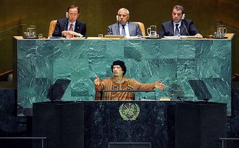 القذافي، في 23/9/2009، يلقي خطابه في الجمعية العامة، وخلفه (ي:ش): شعبان محمد شعبان، نائب الأمين العام للأمم المتحدة لشئون الجمعية العامة، د. علي عبد السلام التريكي، رئيس الجمعية العامة للأمم المتحدة، وبان كي مون، أمين عام الأمم المتحدة