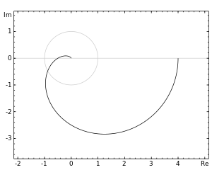 رسم نايكويست. Although the frequencies are not indicated on the curve, it can be inferred that the zero-frequency point is on the right, and the curve spirals toward the origin at high frequency. This is because gain at zero frequency must be purely real (on the X axis) and is commonly non-zero, while most physical processes have some amount of low-pass filtering, so the high-frequency response is zero.