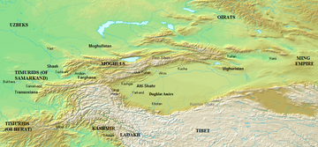 Moghulistan,[أ] also called the Moghul Khanate or the Eastern Chagatai Khanate,[ب] was a Muslim, Mongol, and later Turkic breakaway khanate of the Chagatai Khanate and a historical geographic area north of the Tengri Tagh mountain range,[2] on the border of Central Asia and East Asia. That area today includes parts of Kazakhstan, Kyrgyzstan, and northwest Xinjiang, China. The khanate nominally ruled over the area from the mid-14th century until the late 17th century.
