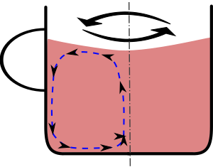 Stirring the liquid makes it spin around the cup, causing a centrifugal force outward. با However, near the bottom and outer edges the liquid is slowed by the friction against the cup. هناك قوة ضرد مركزي أضعف ويصبح اختلاف الضغط أكثر أهمية لتدفق السائل. This is called a boundary layer or more specifically an Ekman layer.[4]