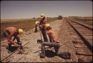 ![]() Railroad crew works on the Atchison, Topeka and Santa Fe tracks near Bellefont, 1974. Photo by Charles O'Rear. |