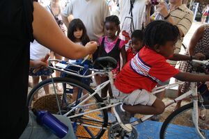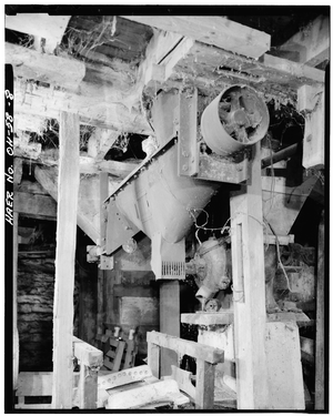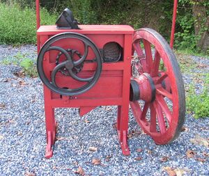 The operation of a corn sheller is similar to a threshing machine, but with some differences to deal with larger grain size and other differences of corn compared to wheat and other crops. Corn shellers can be powered by a hand crank, a tractor, a stationary engine, or by an electric motor. Whole corn cobs are fed in. They are pulled between two toothed wheels, usually made of metal. Each wheel spins the opposite direction of the other. The teeth pull the kernels off the cob until there are no kernels left. The kernels fall out through a screen into a container (such as a bucket) placed underneath the machine. The cob is then ejected out, since it cannot pass through the screen. Some models have a "walker", similar to a threshing machine or combine, to take the cobs out.