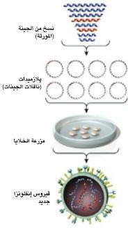 إن تقنية الوراثيات العكسية المعتمدة على الپلازميدات تسمح للعلماء بتصنيع ڤيروسات الإنفلونزا حسب الطلب. يتم إقحام نسخ دنَوية لجينات مأخوذة من سلالتين مختلفتين من الإنفلونزا (الأحمر والأزرق) ضمن حلقات صغيرة من الدنا تدعى الپلازميدات، ثم تحقن الپلازميدات الحاملة للجينات في مزرعة خلايا حية وهذه بدورها تقوم بتصنيع ڤيروسات كاملة للإنفلونزا تكون محتوية على المجموعة المطلوبة من الجينات.