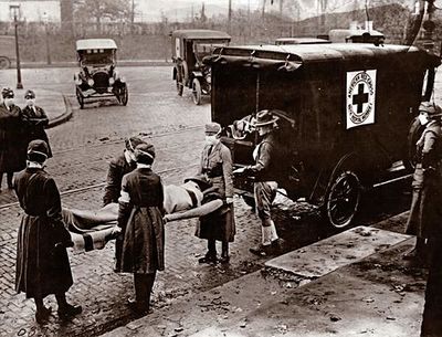 ممرضات الصليب الأحمر في سانت لويس يحملن مريضا بالإنفلونزا في عام 1918. قام العاملون في القطاع الصحي والشرطة والجمهور المذعور بوضع أقنعة على الوجه للوقاية من الڤيروس الذي اجتاح البلاد. أصيب ثلث عدد الأمريكيين تقريبا أثناء الجائحة، توفي 000 675 منهم.