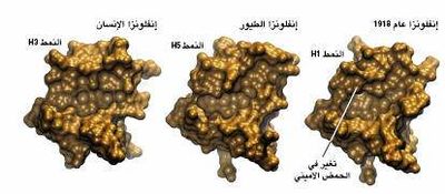 وقد رأينا على سبيل المثال أن جزء الپروتين HA من ڤيروس عام 1918 الذي يرتبط بخلايا العائل المصاب، يماثل تقريبا موضع الارتباط الخاص بالپروتين HA الذي يعود لڤيروس يصيب الطيور حصريا [انظر الشكل في أسفل هذه الصفحة]. كان موقع ارتباط المستقبلات الخلوية يختلف في اثنتين من عزلات(1) عام 1918 عن ما هي الحال في الشكل الطيري بحمض أميني واحد فقط كوحدة بنائية لپروتين الڤيروس. وفي العزلات الثلاث الأخرى حدث تبدل في حمض أميني آخر. قد تمثل هذه الطفرات التي تبدو طفيفة، الحد الأدنى من التبدل اللازم للسماح للپروتين HA من النمط الطيري بالارتباط بالمستقبلات الخاصة في الثدييات