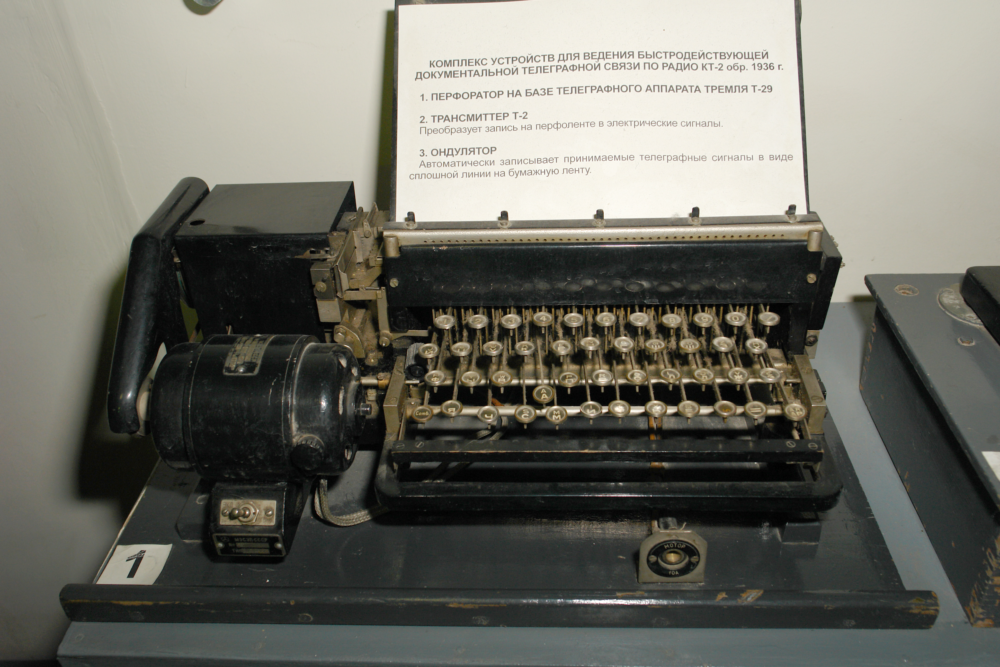 КОМПЛЕКС УСТРОЙСТВ ДЛЯ ВЕДЕНИЯ БЫСТРОДЕЙСТВУЮЩЕЙ ДОКУМЕНТАЛЬНОЙ ТЕЛЕГРАФНОЙ СВЯЗИ ПО РАДИО КТ-2 обр. 1936 г. 1. ПЕРФОРАТОР НА БАЗЕ ТЕЛЕГРАФНОГО АППАРАТА ТРЕМЛЯ Т-29 Военно-исторический музей артиллерии, инженерных войск и войск связи, Санкт-Петербург. |