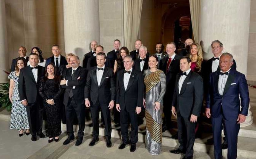 - الصف الأول الأمامي، من اليمين: روبرت كندي الابن (الصحة)، ماركو روبيو (الخارجية)، بروك رولينز (الزراعة)، دوگ برگم (الداخلية)، پيت هِگسِث (الدفاع)، هوارد لوتنك (التجارة)، لوري تشاڤيز-دورمر (العمل)، جون راتكليف (سي آي إيه)، وإليز ستفانيك (س. للأمم المتحدة).
