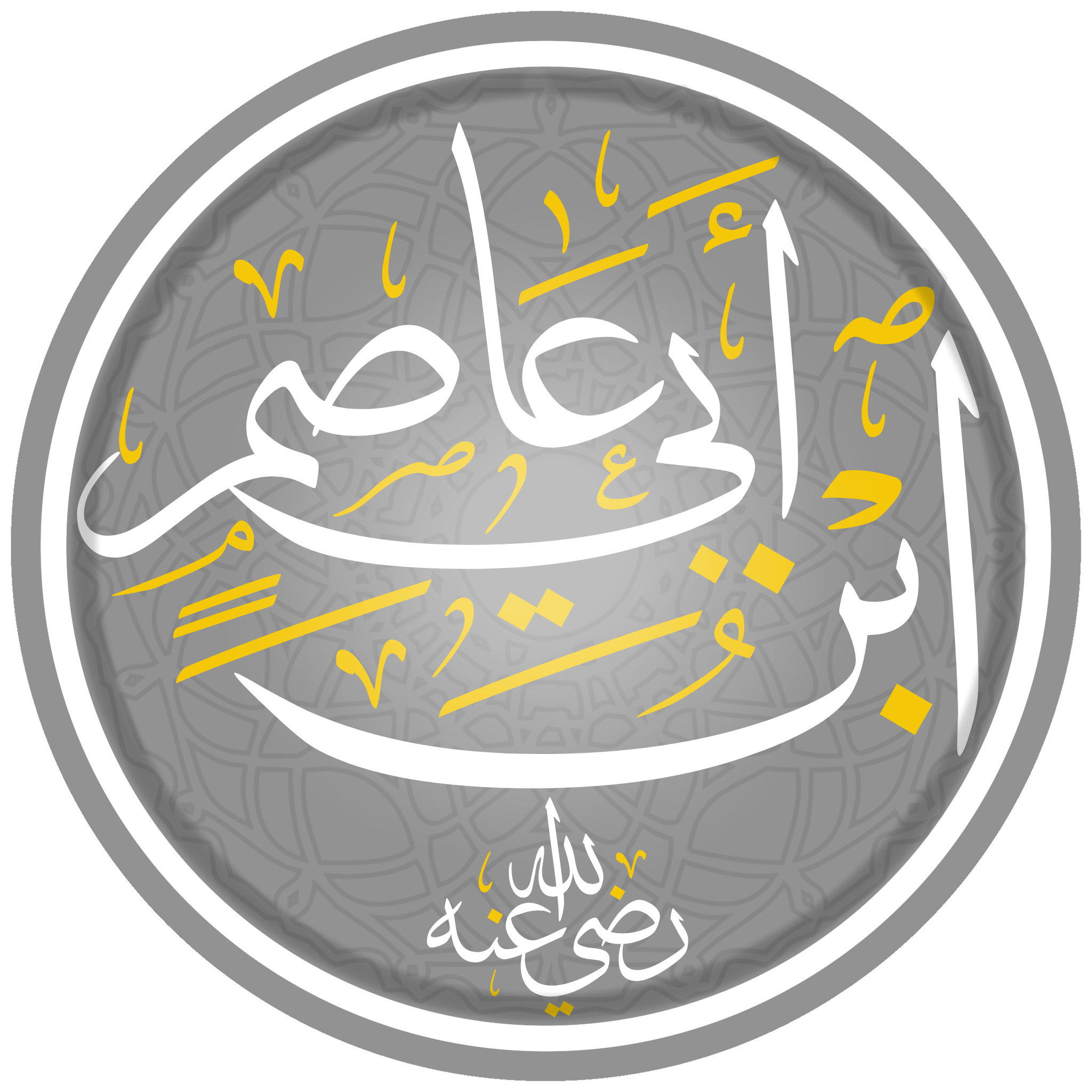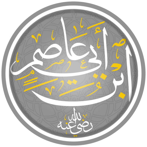 العربية: تخطيط اسم ابن أبي عاصم الظاهري بخط الثُّلُث العربي، ملحوقًا بالترضي عنه: «رضي الله عنه»