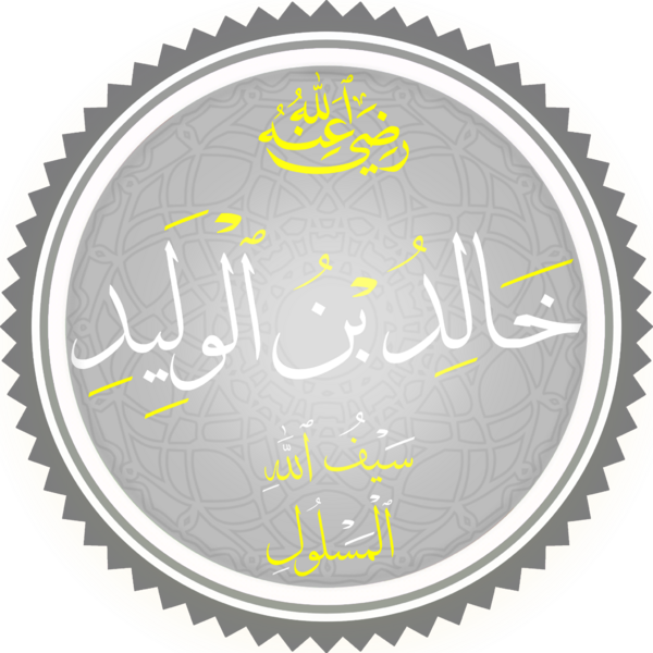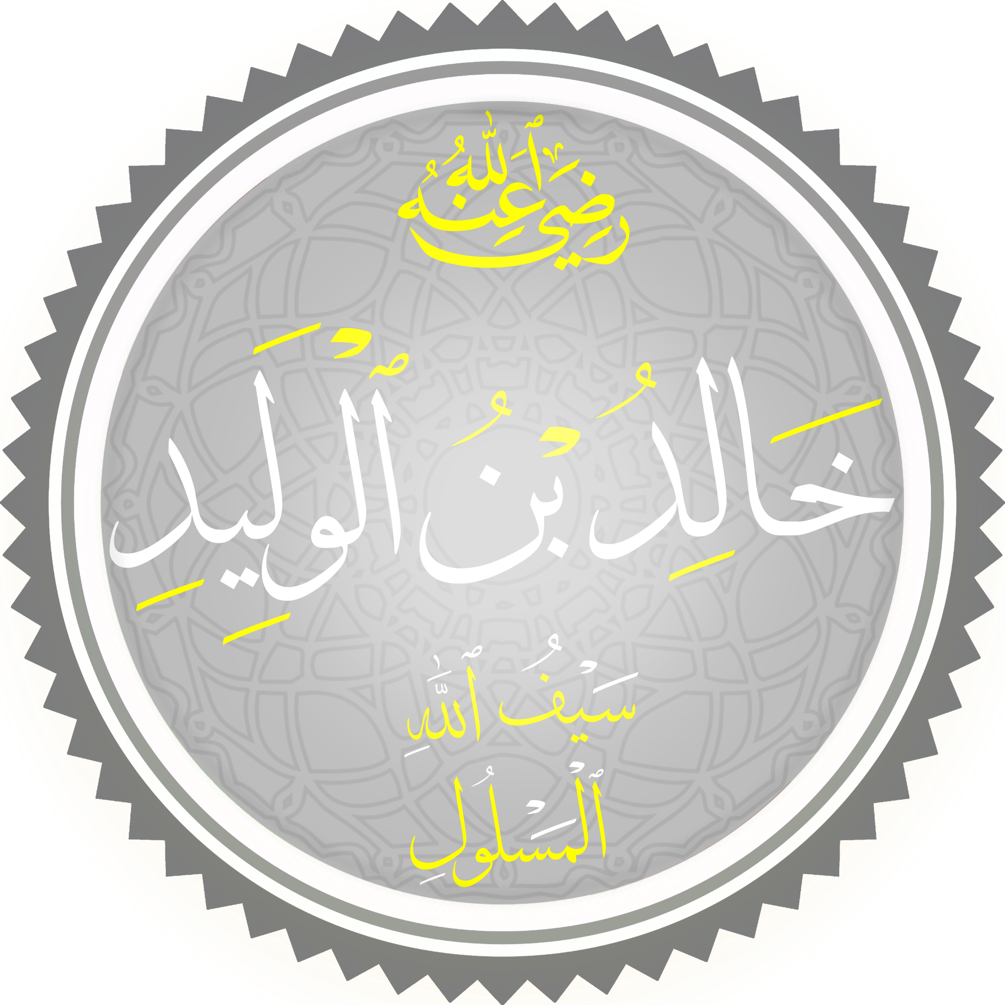 العربية: إطارٌ مُخطَّط بخطِّ الثُّلث ومصبوغًا باللَّونِ الرُّمادي على الصحابي خالد بن الوليد رضي الله عنه