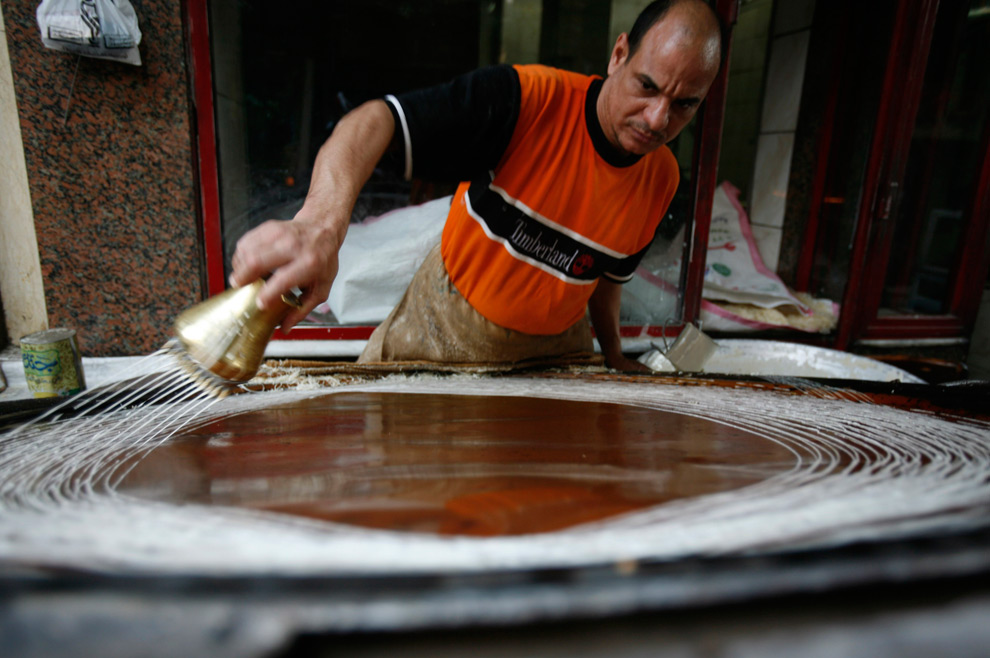 مصري يصنع الكنافة، أحد أنواع الحلوى التقليدية في رمضان، القاهرة، مصر.