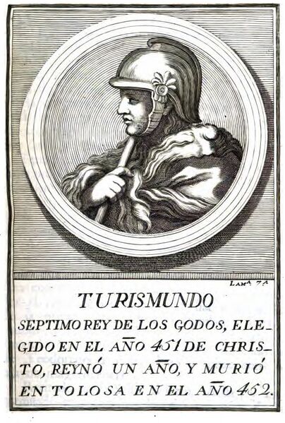 Français : Portrait de TURISMUNDO, roi Wisigoth, n° 7 dans l'ordre chronologique du livre digitalisé par Google depuis la librairie de l'Université d'Oxford.