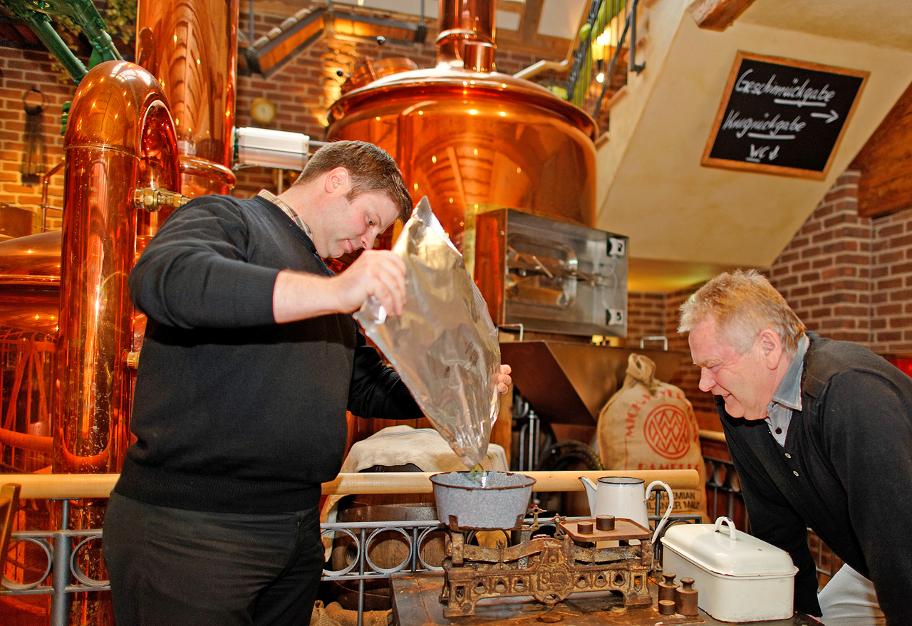 Deutsch: Pfarrer Steffel und Bürgermeister Heribert Weber wiegen Hopfen ab