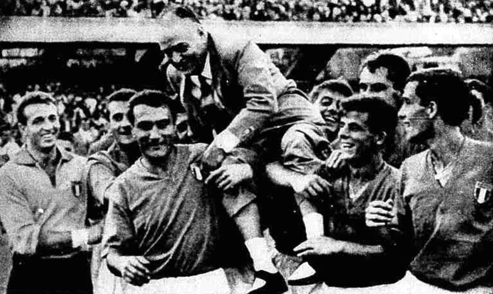 Naples (Italy),"San Paolo" Stadium, September 29, 1963. Italy - Turkey 3-0, IV Mediterranean Games — Naples 1963, football tournament final: Italy's celebration for the gold medal. |