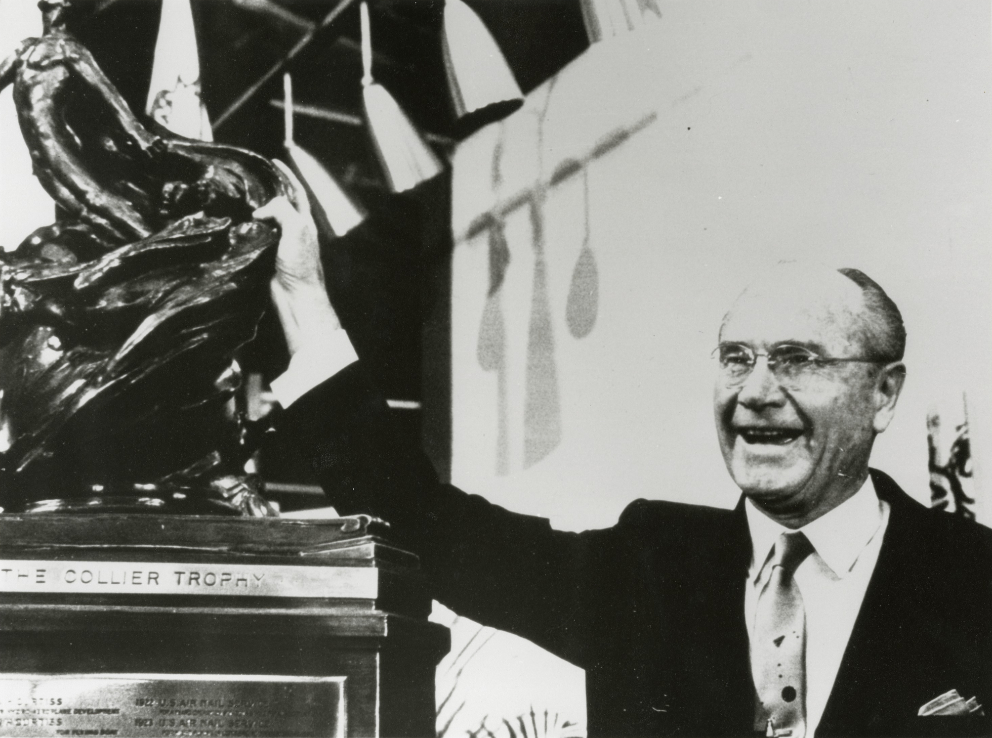 English: 1966 – James McDonnell for development work in aeronautics and astronautics, specifically on the F-4 Phantom and Gemini[. James Smith McDonnell Jr. (18991980), founder of McDonnell Aircraft Corporation (later McDonnell Douglas) posing with the Collier Trophy, which was awarded to him in 1966