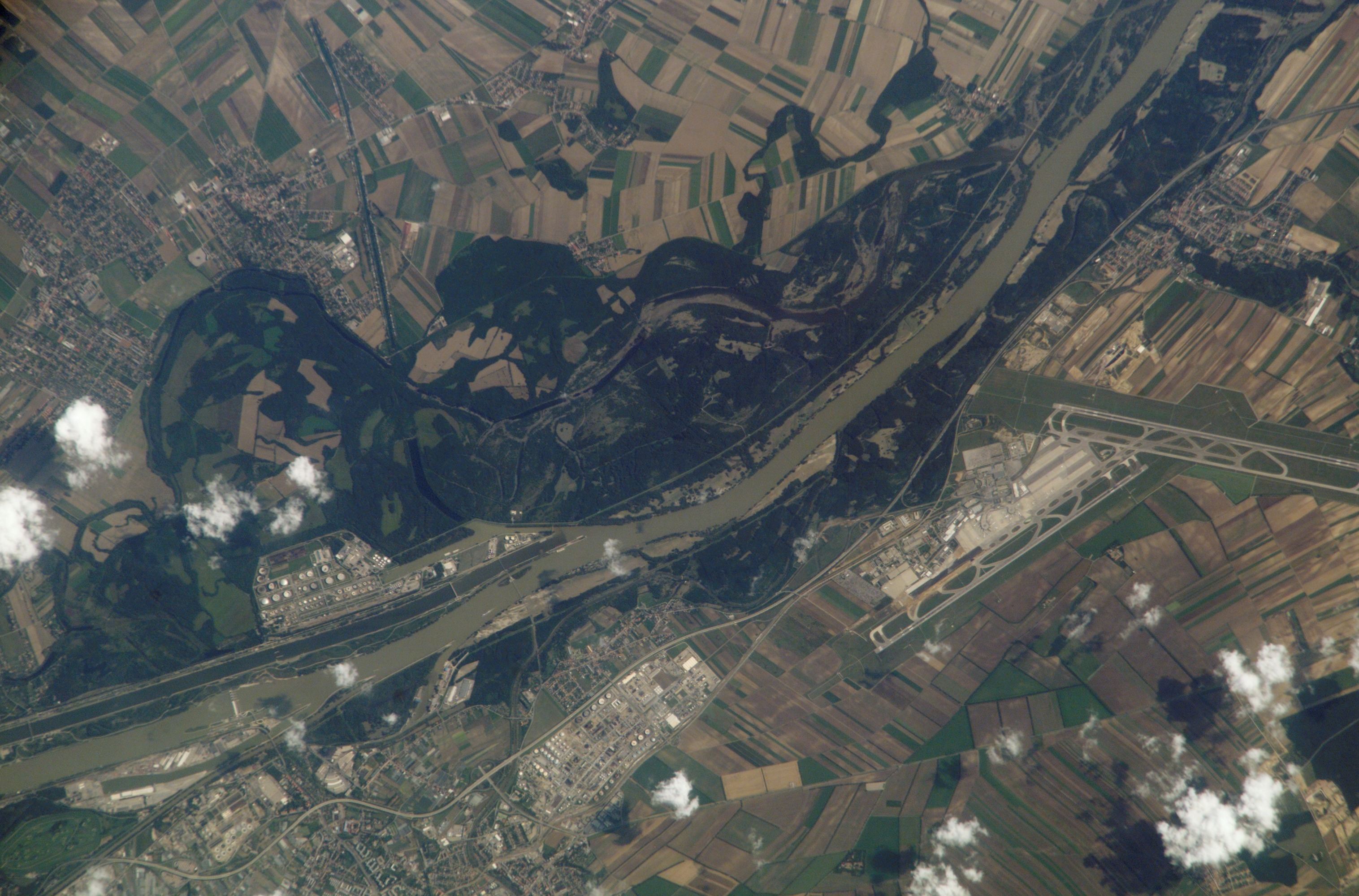 English: NASA landscape image showing the Lobau (nort of the Danube River) and the Schwechat Airport, east of Vienna, Austria.