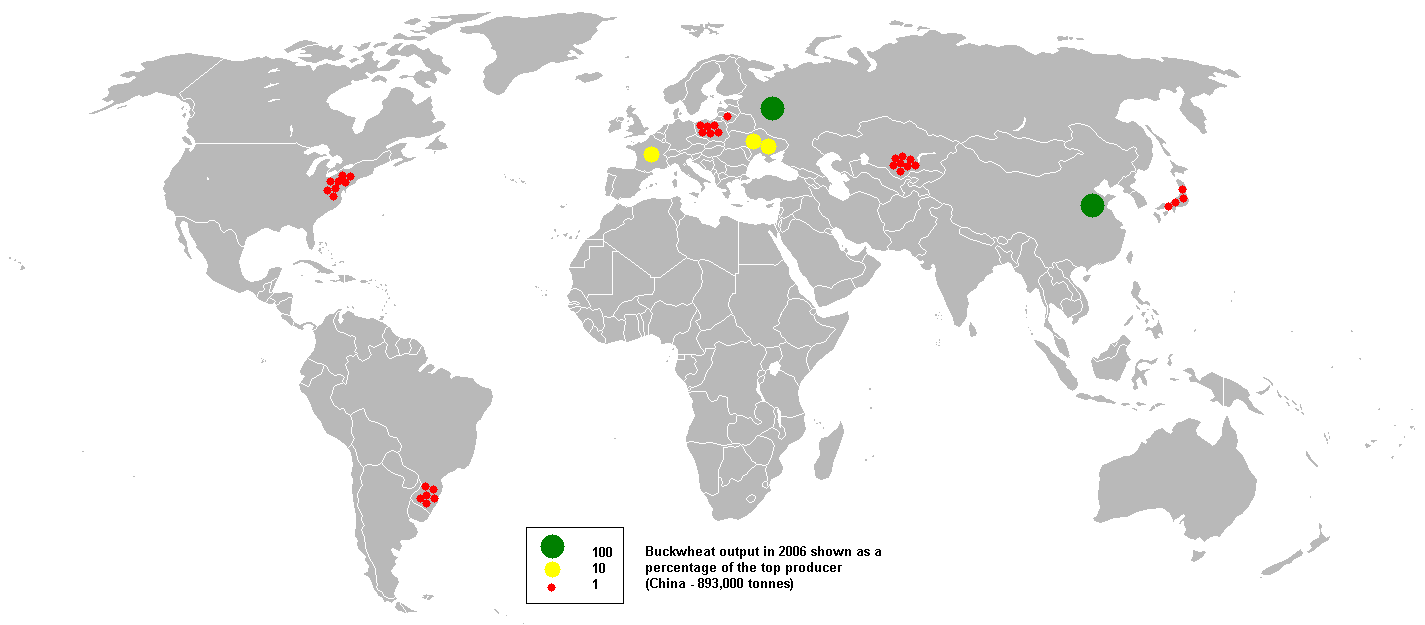 This bubble map shows the global distribution of buckwheat output in 2006 as a percentage of the top producer (China - 893,000 tonnes). This map is consistent with incomplete set of data too as long as the top producer is known. It resolves the accessibility issues faced by colour-coded maps that may not be properly rendered in old computer screens. Based on Image:BlankMap-World.png |