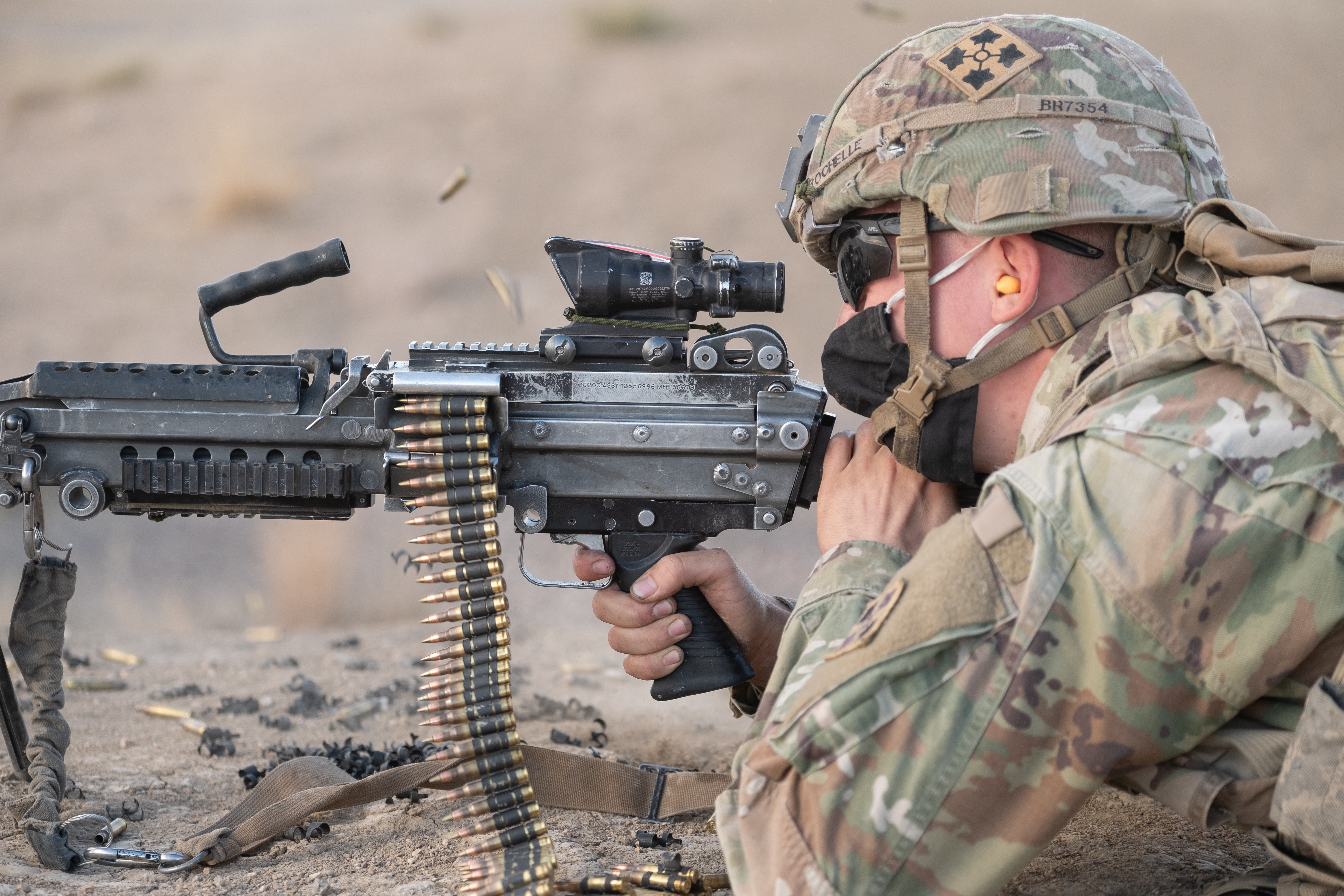 English: Pvt. Brooks Rochelle, an infantryman assigned to Charlie Company, 1st Battalion, 38th Infantry Regiment, 1st Stryker Brigade Combat Team, 4th Infantry Division, fires an M249 squad automatic weapon during qualification at Fort Carson, Colorado, November 3, 2020. All M249 firers qualified expert during daytime qualification. (U.S. Army photo by Capt. Daniel Parker)