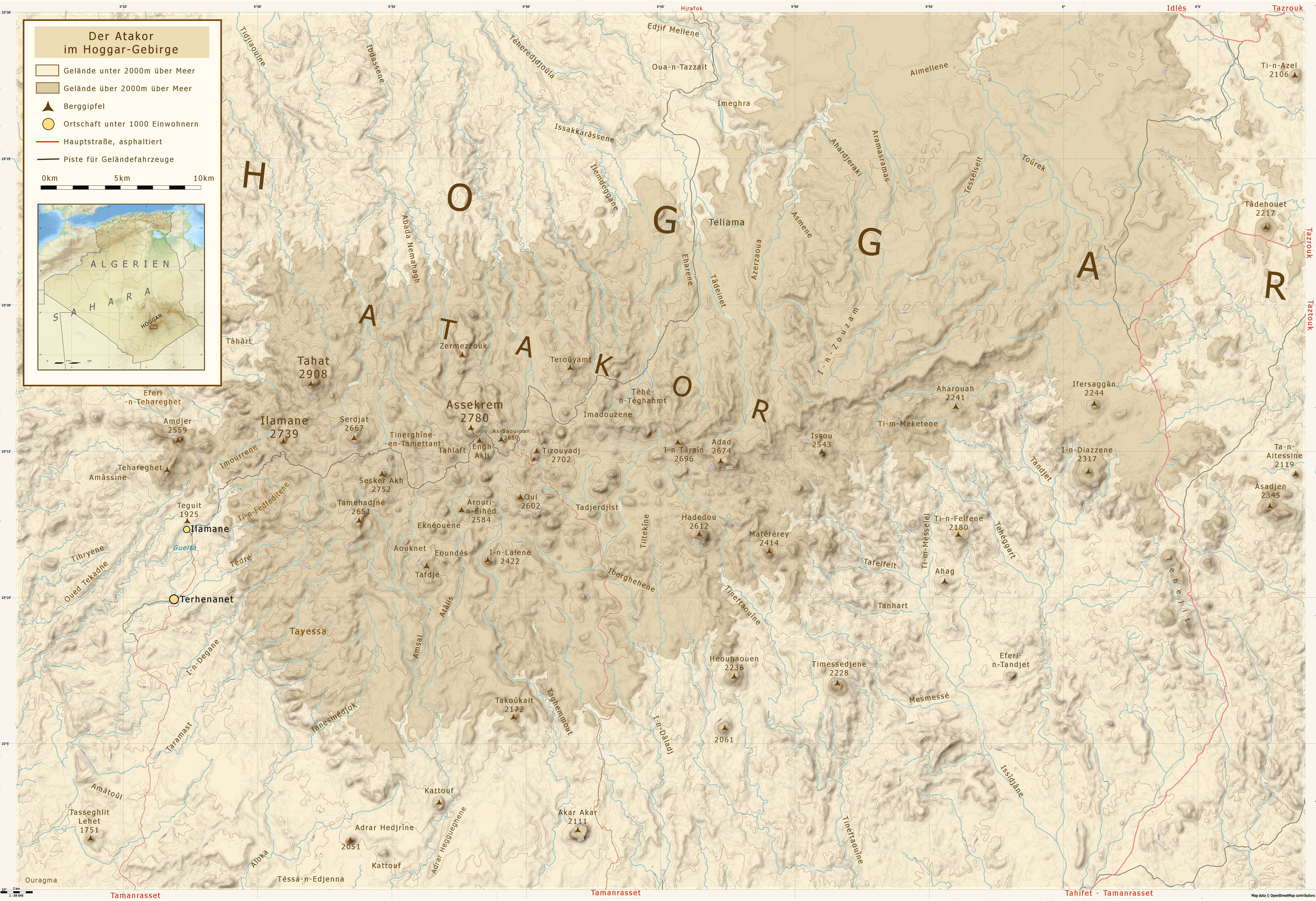 Deutsch: Topografische Karte des Atakor im Hoggar-Gebirge