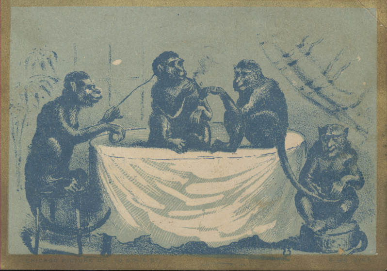 Subject (TGM): Monkeys; Baboons; Animal behavior; Animal grooming; Humorous pictures; Stoves; Safety equipment; Appliances; Stove industry; Keywords: Oil stove Patent double walled air box Wire gauze wick pockets Sir Humphrey Davy Safety Lamp A & W Stove |