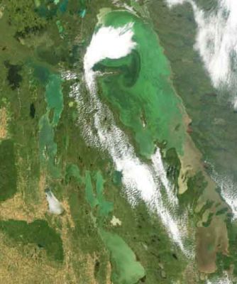 English: Satellite images of lake winnipeg provided by Moderate Resolution Imaging Spectroradiometer (MODIS)Rapid Response Team University of Maryland and NASA on Greg McCullough's public research website.