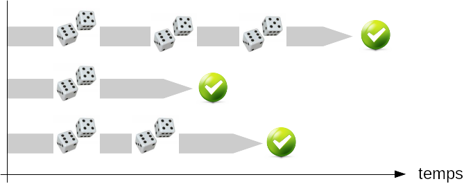 Français : L'image montre une vue imagée de plusieurs exécutions d'un algorithme Las Vegas. L'algorithme termine toujours avec une solution, mais le temps d'exécution varie.