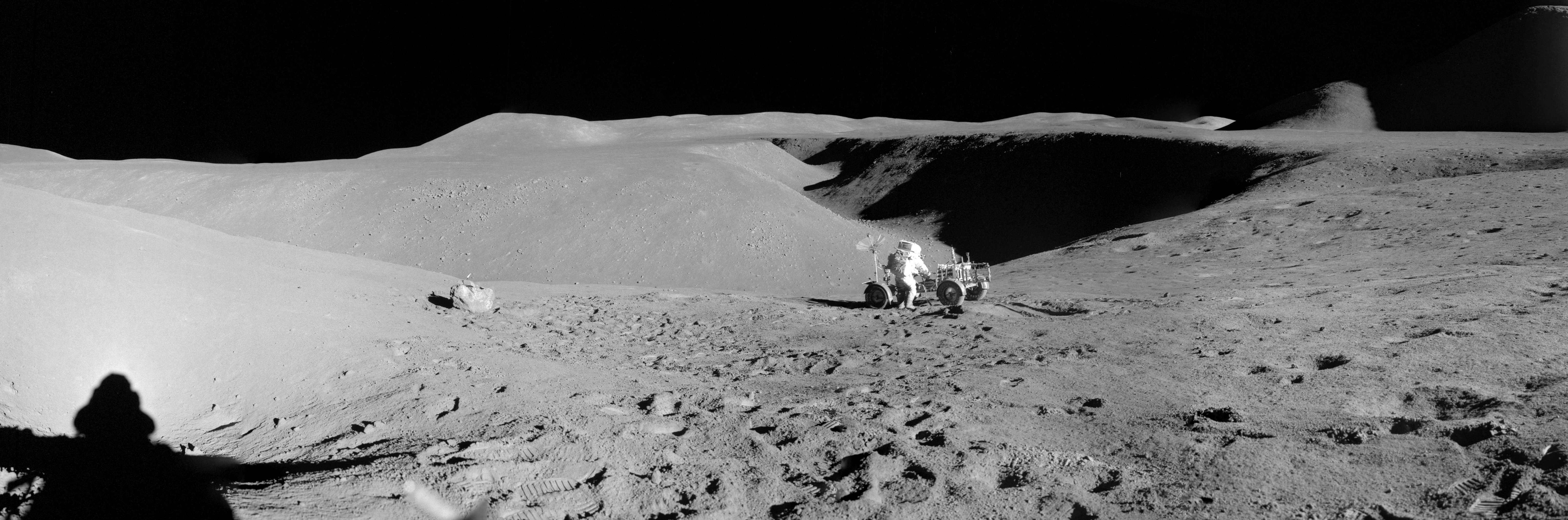 Vista panorámica tomada el 31 de julio de 1971 por James B. Irwin, en el Rover lunar se encuentra David R. Scott. |