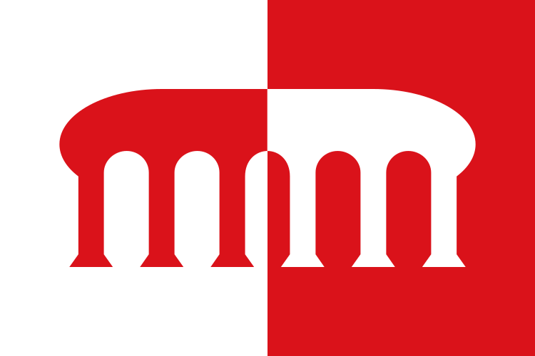 Català: Bandera apaïsada, de proporcions dos d'alt per tres de llarg, bicolor vertical blanca i vermella, amb el pont de cinc arcs de l'escut, d'alçària 1/2 de la del drap i llargària 7/9 de la del mateix drap, la primera meitat vermella i la segona blanca. [1] / Español: Bandera apaisada, de proporciones dos de alto por tres de largo, bicolor vertical blanca y roja, con el puente de cinco arcos del escudo, de altura 1/2 de la del paño y largura 7/9 de la del mismo paño, la primera mitad roja y la segunda blanca.[2]