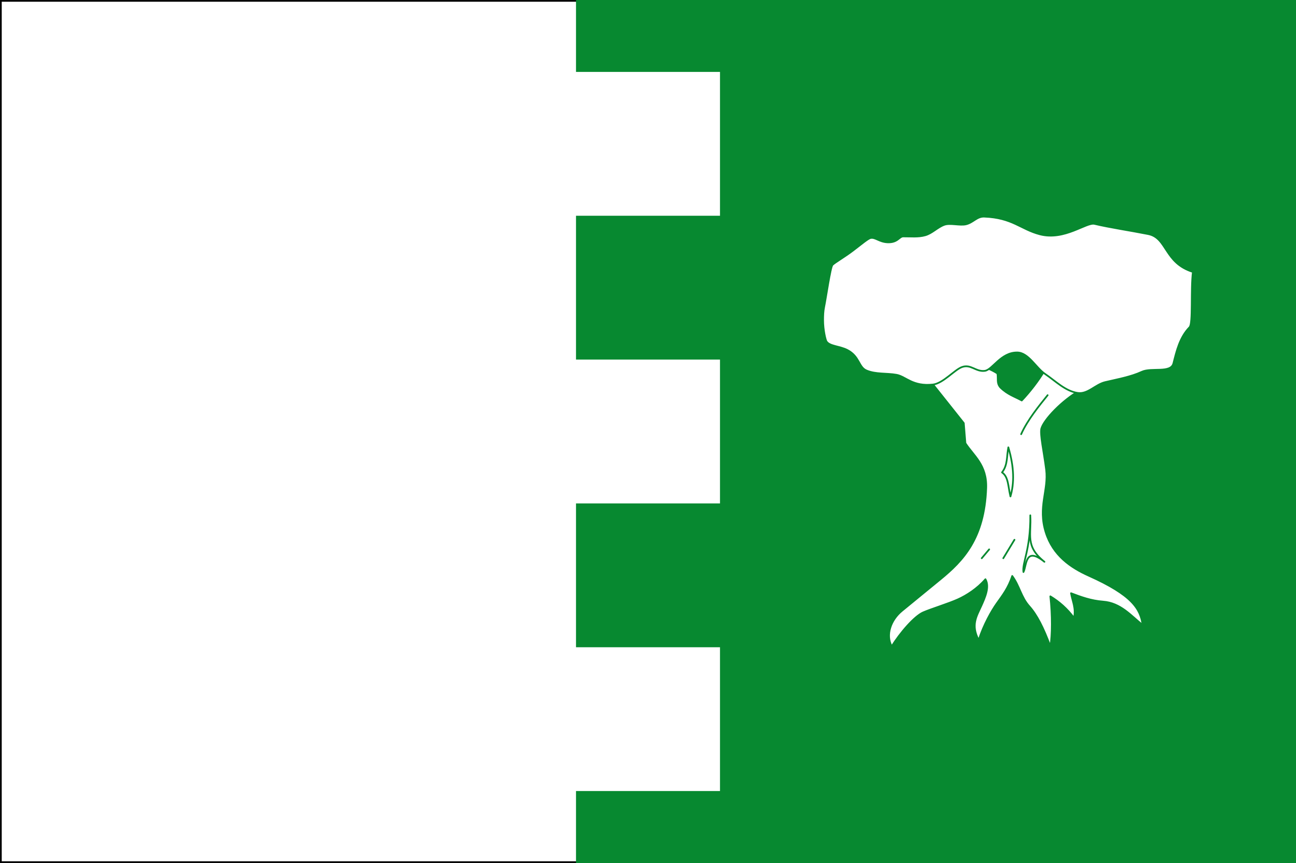Rectangular de proporciones 2:3, formada por dos franjas verticales encajadas e iguales, blanca al asta y verde con olivo blanco al batiente. Referencia: B.O.J.A. n.º 112 de 10/06/2005 |