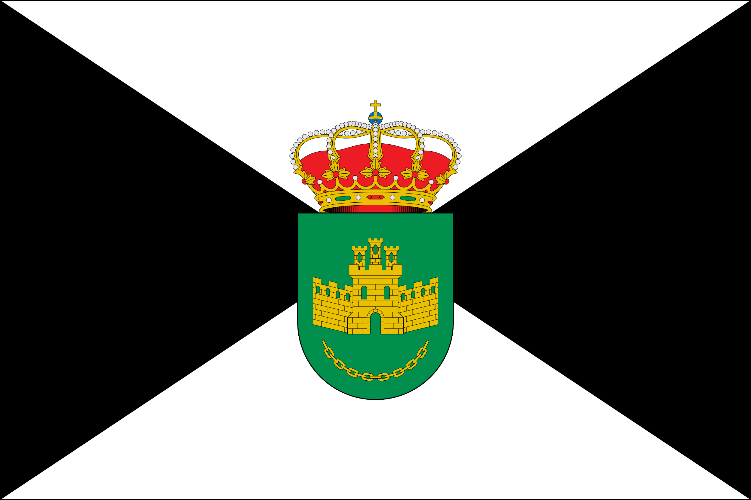 Rectangular, de tres módulos de larga por cada dos de ancha, cortada en cuatro áreas cromáticas triangulares dispuestas en torno a dos ejes diagonales, las áreas superior e inferior blancas y las dos laterales en negro. Cargada sobre su eje geométrico, en el centro del vexilo, el escudo de la villa. Referencia: B.O.J.A. n.º 82 de 19/07/2001 |