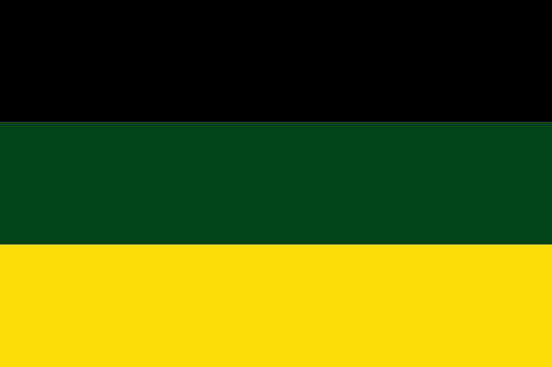 Español: Bandera apaisada, de proporciones dos de alto por tres de largo, tricolor horizontal: negra, amarilla y verde oscuro.[2]