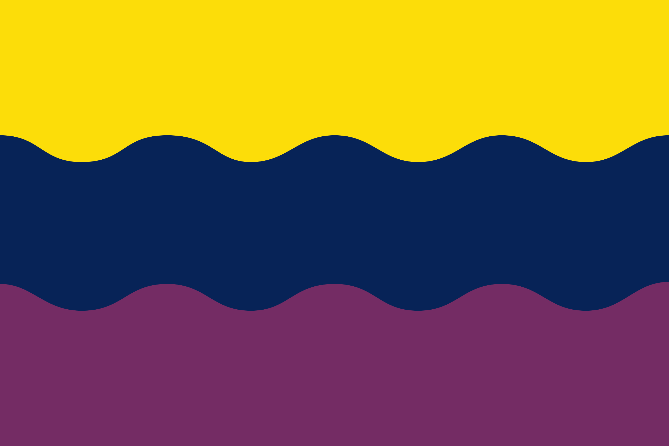 Español: Bandera apaisada, de proporciones dos de alto por tres de largo, tricolor horizontal ondada de media, tres y media crestas, amarillo, azul oscuro y púrpura. [2]