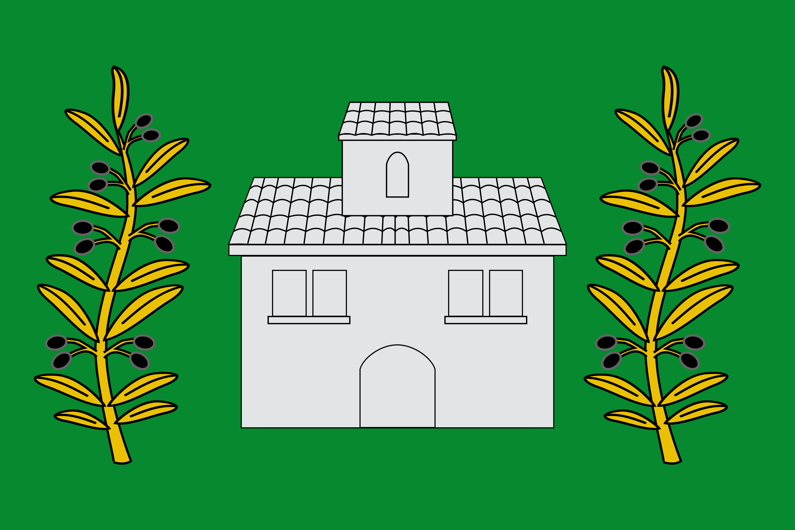 Español: Bandera de Masdenverge, Tarragona, España. Bandera de proporciones 2:3, verde oscura con la masía blanca del escudo de altura 9/20 de la del paño y anchura 8/15 de la largura del mismo paño, en el centro, y con las dos ramas de olivo amarillas frutadas de negro del escudo, de altura 4/5 y anchura 1/6, puestas a cada lado de la masía, centradas y a 1/15 de los bordes de la asta y del vuelo.[2]