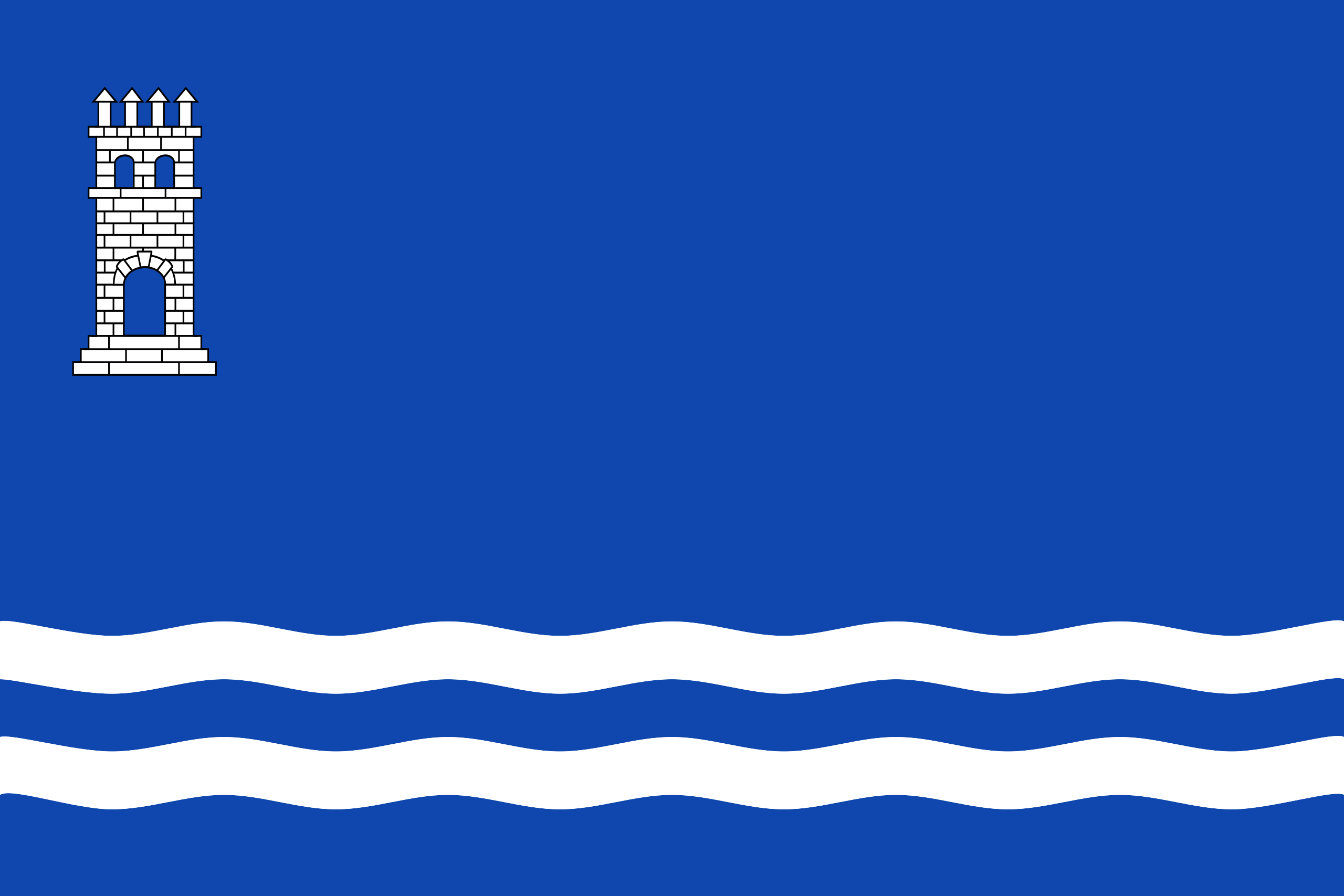 Español: Bandera de Montgat, Barcelona, España. Bandera apaisada, de proporciones dos de alto por tres de largo, azul oscuro, con la torre blanca de puerta y ventanas azules del escudo, de altura 20/62 de la del paño y anchura 10/93 de la largura del mismo paño, puesta a 6/62 del borde superior y a 5/93 del borde del asta; y con dos fajas ondeadas blancas, cada una de media, cinco y media crestas de grueso 4/62 de la altura del paño, separadas, la de arriba de la de abajo por un espacio de 3/62 de la misma altura, y la de abajo del borde inferior por un espacio de 6/62.[2]