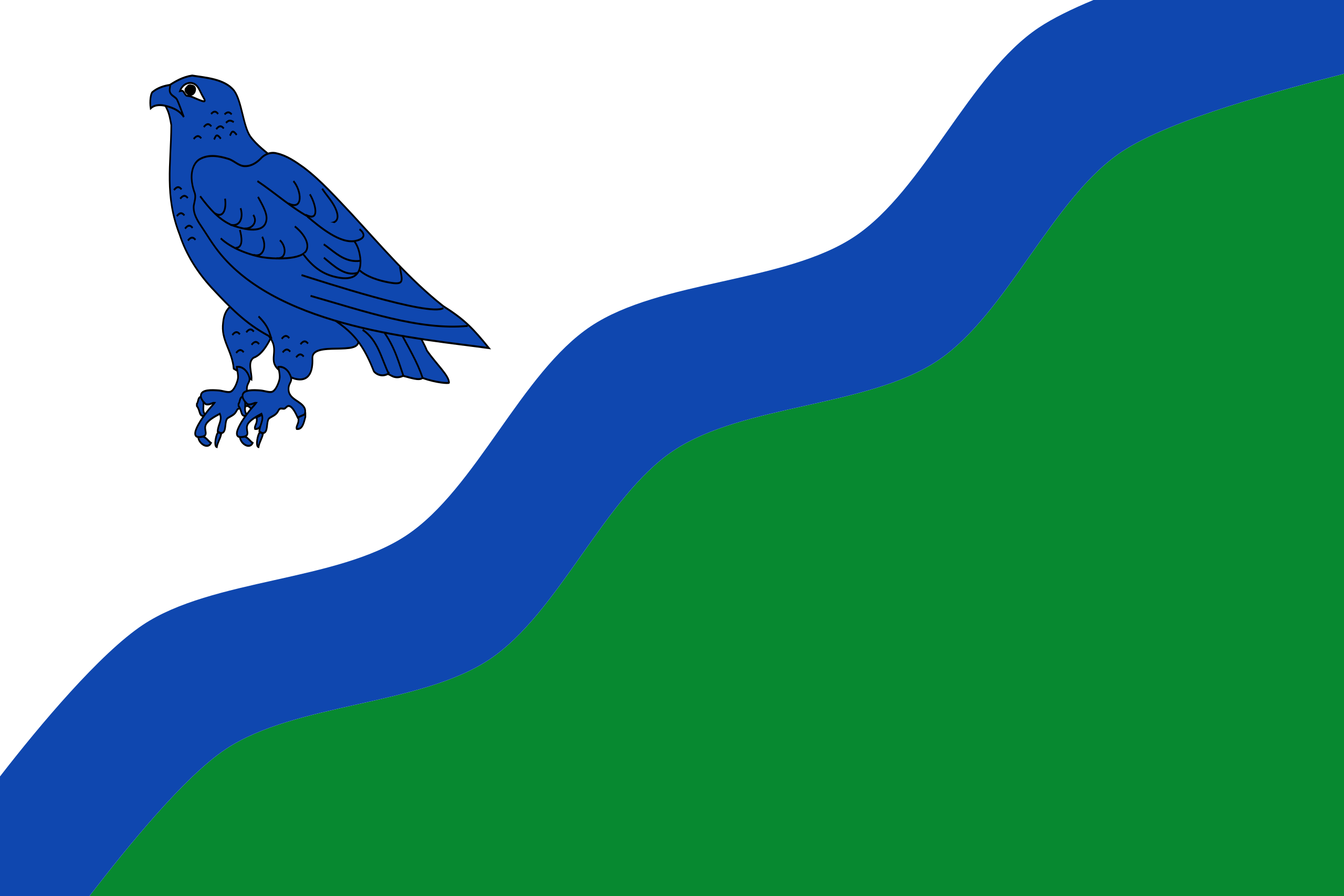 Español: Bandera apaisada, de proporciones dos de alto por tres de largo, dividida en barra por una barra azul ondada de tres olas y de anchura de 1/6 del alto de la bandera. El campo del palo de color blanco, y cargado al lado de un cernícalo azul, de altura de 5/12, y separado del palo por 1/6, y del extremo superior de la tela por 1/12, y el campo del vuelo de color verde.[2]