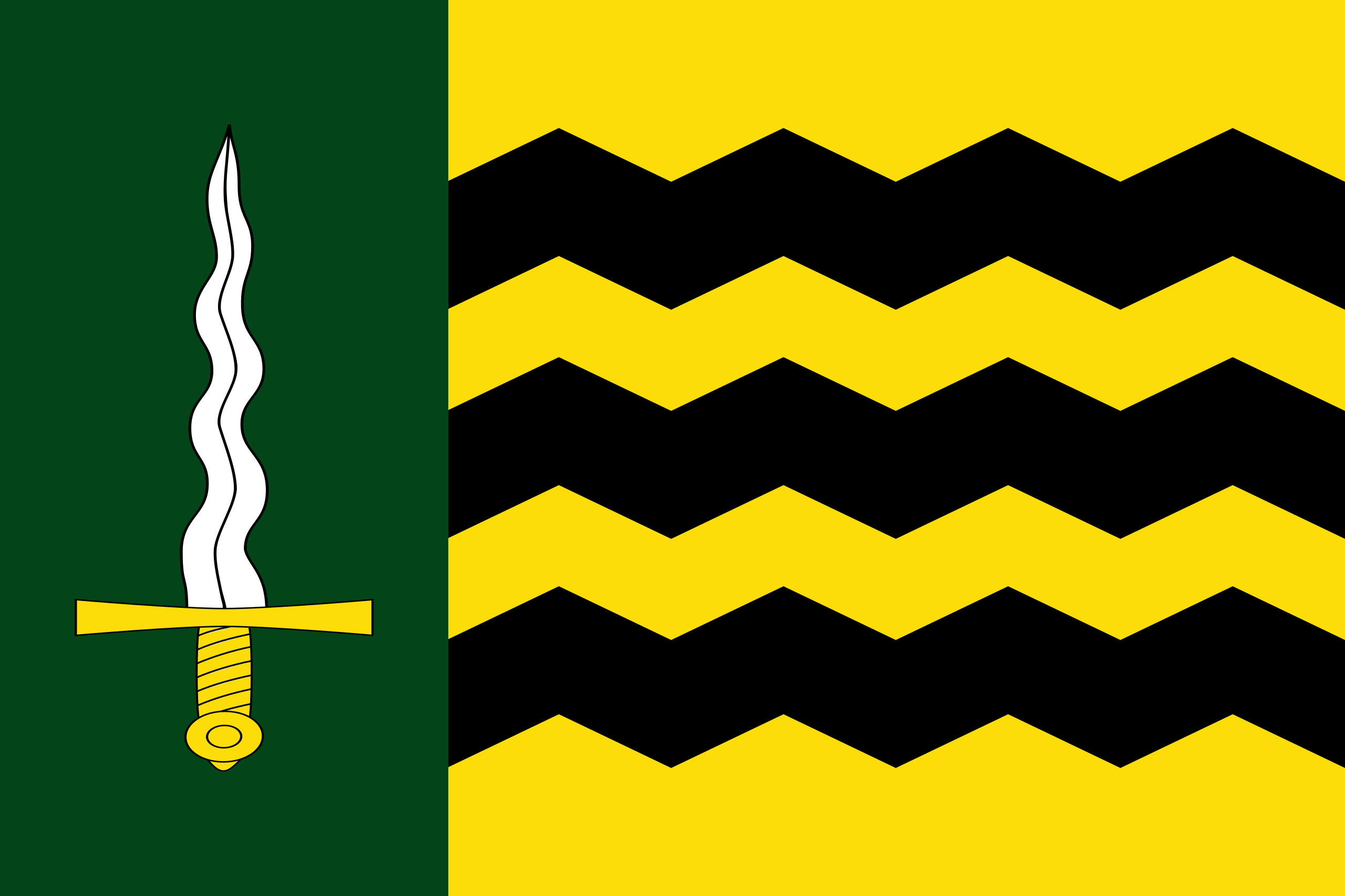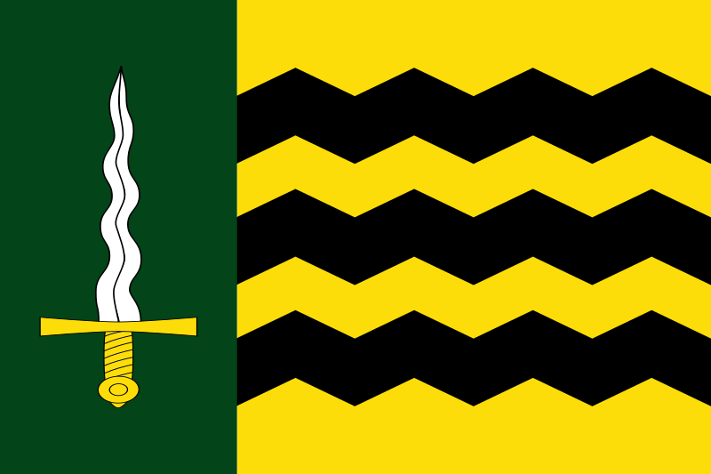 Español: Bandera apaisada, de proporciones dos de alto por tres de largo, amarilla, con tres fajas vibradas negras, cada una de cuatro puntas arriba y tres abajo, y el primer tercio vertical verde oscuro, con la espada flambante con la punta hacia arriba blanca guarnecida de amarillo, de altura 13/18 de la del paño y anchura 2/9 de la largura del mismo paño, en el centro.[2]
