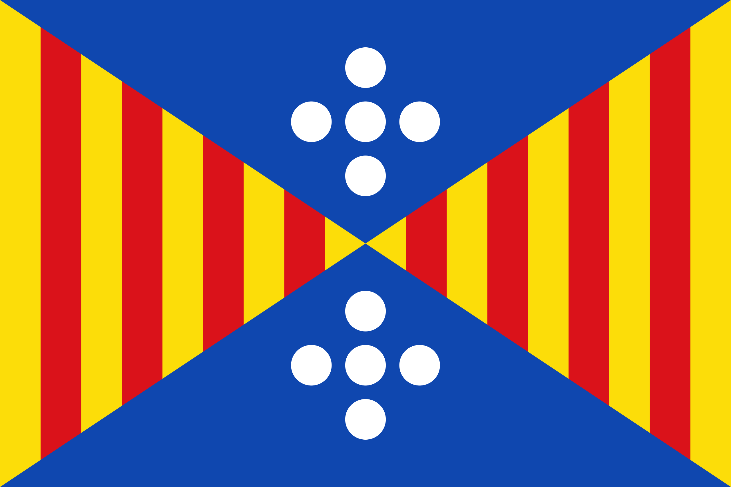 English: Flag of Vilagrassa, in Lleida province, Spain. Flag quartered in saltire. Blue top and bottom each with five white discs in the shape of a cross, the discs as wide as 1/12 of the flag's height and separated from one another by 1/36 of the flag's height, centred on each triangle. Yellow hoist and fly each with four vertical red stripes. (Source: http://flagspot.net/flags/es-l-vgs.html)