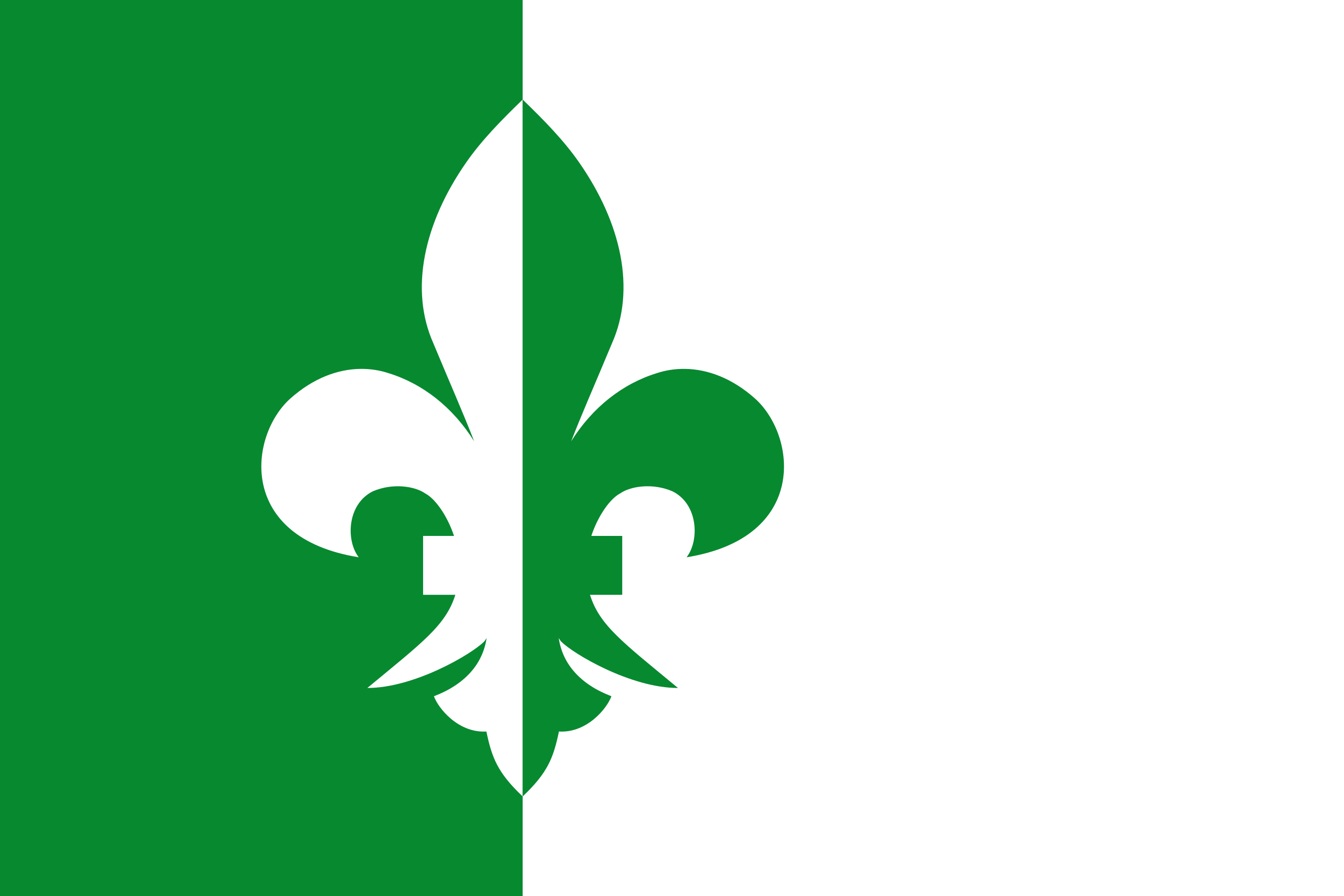 Español: Bandera apaisada, de proporciones dos de alto por tres de largo, bicolor vertical verde y blanca, verde al lado del palo y blanca al del vuelo. La parte verde ocupa 7/18 partes del largo de la tela y la parte blanca el resto. Sobre la divisoria de los dos colores, una flor de lis de una altura de 7/9 partes de la de la tela de colores del uno en el otro. [2]