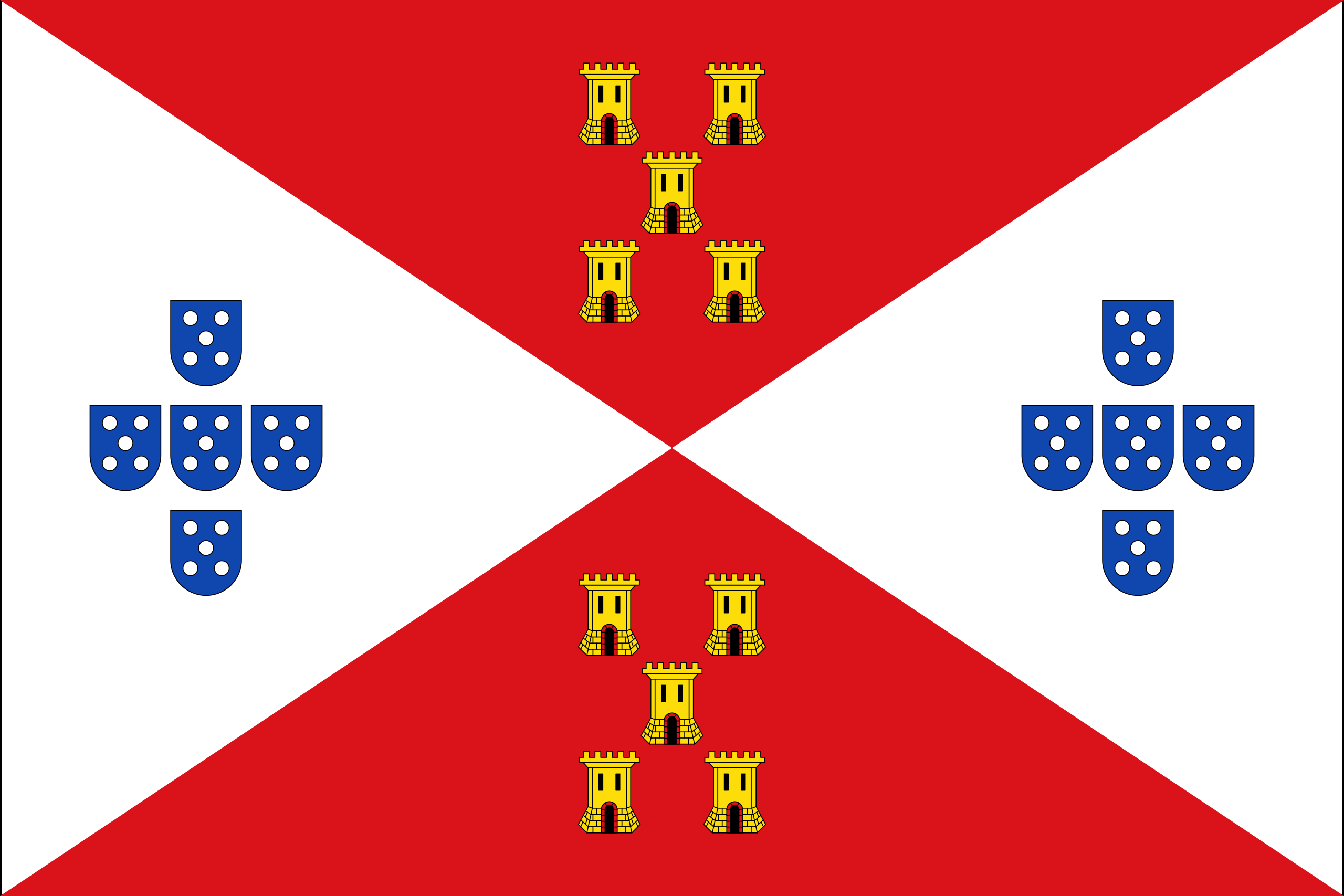 Bandera rectangular en la proporción 2:3, es decir, tres partes de longitud -del asta al batiente- por dos de anchura, cuartelada en aspa: 1.º y 4.º, de gules (color rojo) con cinco torres de oro (color amarillo) colocadas en sotuer, 2.º y 3.º, de plata (color blanco) con cinco escudetes de azur (color azul) colocados en cruz y cargado cada uno con cinco bezantes de plata en sotuer. Referencia: B.O.J.A. nº 91 de 13/05/2013 |