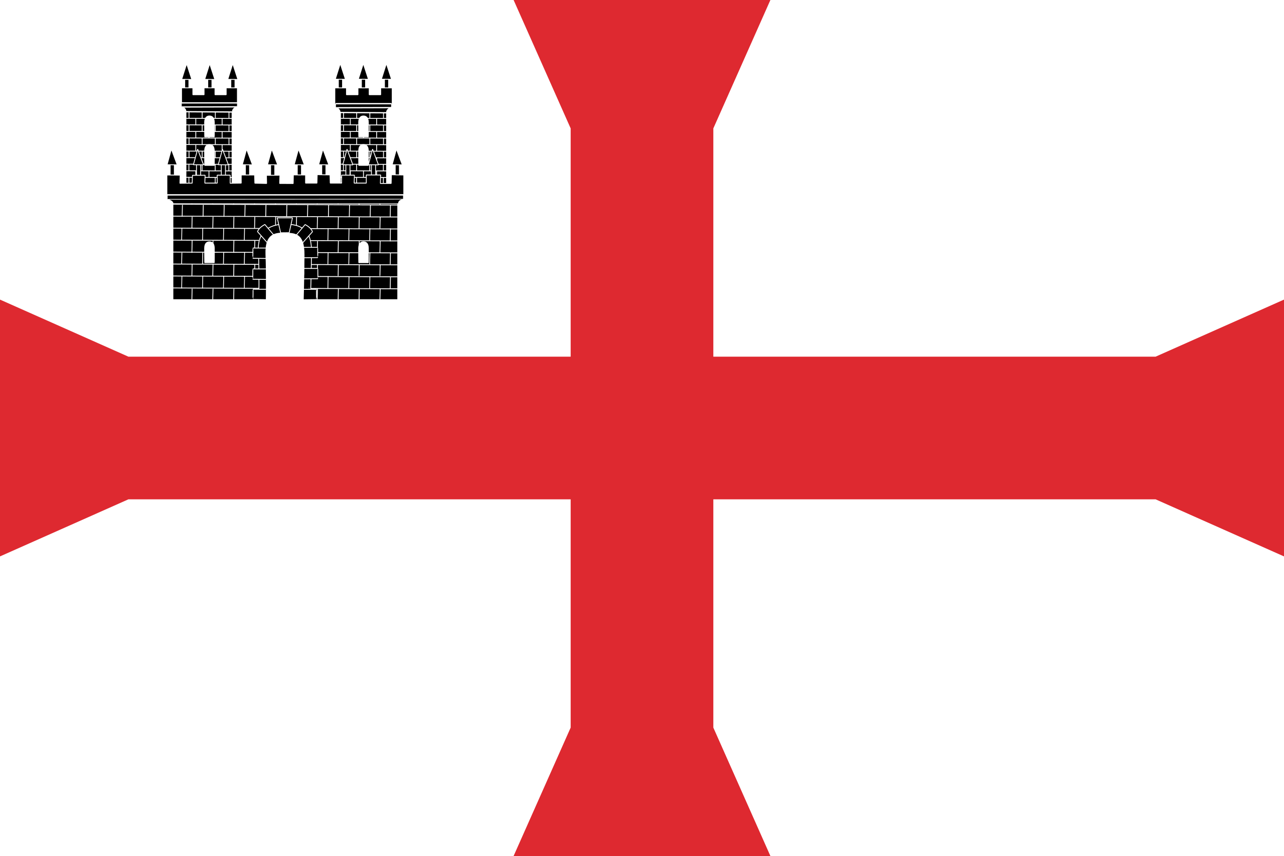 Español: Bandera apaisada, de proporciones dos de alto por tres de largo, blanca, con una cruz patada llena roja con los brazos de grueso 1/6 de la altura del paño en su centro y de 3/10 de la misma altura en los extremos; y la domus del escudo negra de altura 5/18 de la del paño y anchura 5/27 de la largura del mismo paño, en el centro del primer cantón.[2]