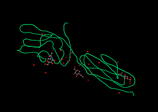 Extracytoplasmic segment of the Uman CD2 antigen, in green the protein, at the upper left the adesion domain, where is clearly recognizable the Ig structure with the three loops. There are also shown the N-ac-GLU residues where is developed a poliantennary glication based on D-man and Glu. On the right side is the proximal ig domain. |